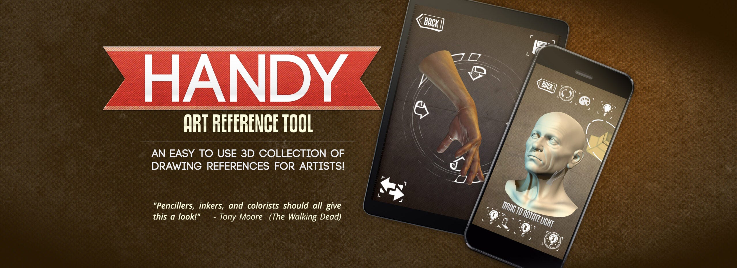 3D pose reference app, consisting of hands, feet, heads, and props. Includes posable models, rotatable camera, and editable lights. Available on the App Store, Google Play, Mac App Store, and Microsoft Store.