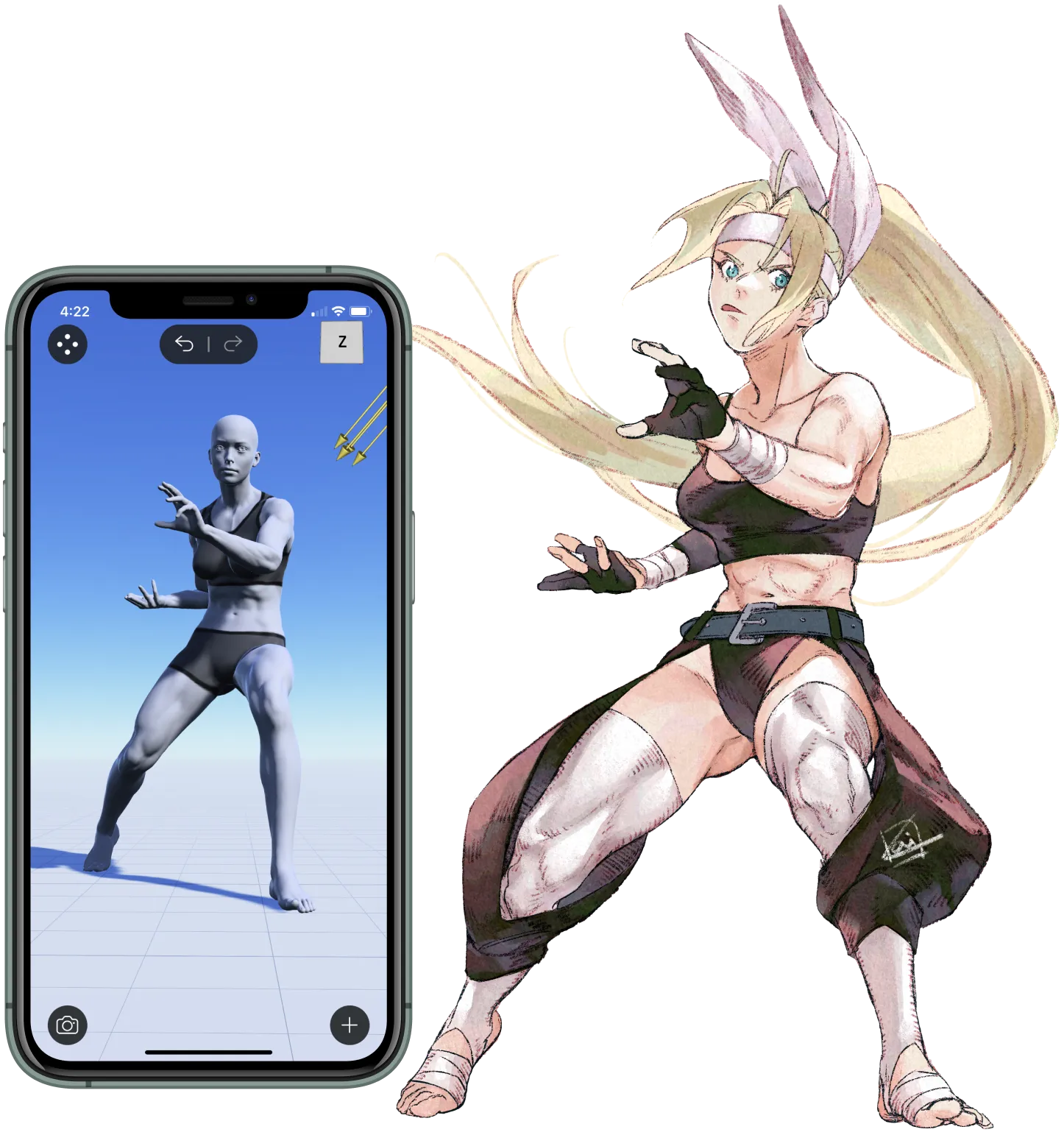 3D pose reference app, available on App Store and Google Play. Includes huge pose library, adjustable lighting, and props.